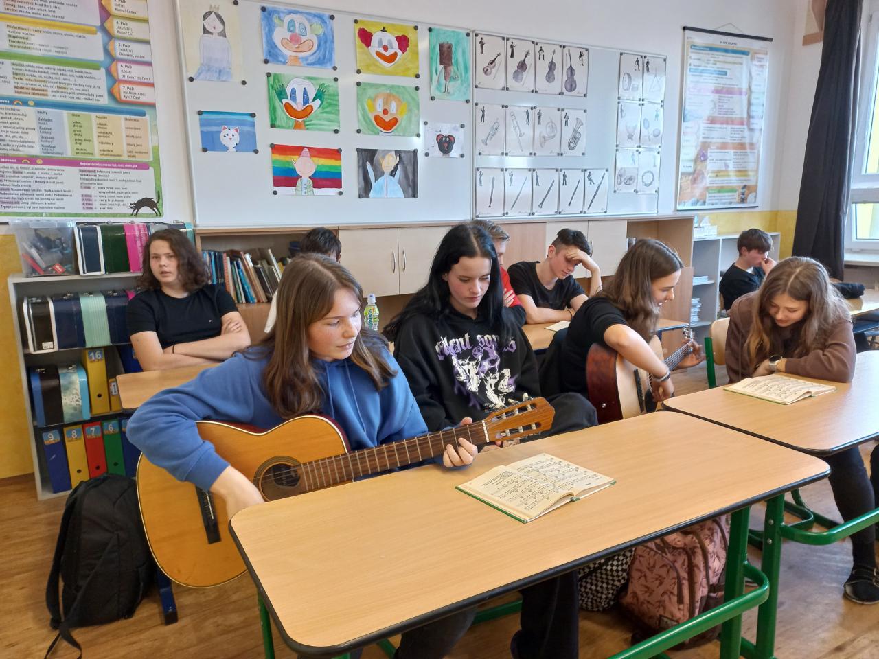 V hudební výchově probíráme různá témata. Tentokrát jsme hráli a zpívali trampské písně.