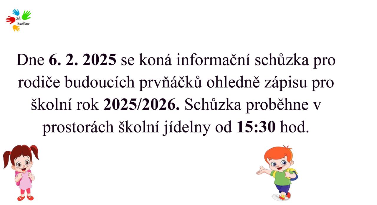 Dne 6. 2. 2025 se koná informační schůzka pro rodiče budoucích prvňáčků ohledně zápisu pro školní rok 2025/2026. Schůzka proběhne v prostorách školní jídelny od 15:30 hod.