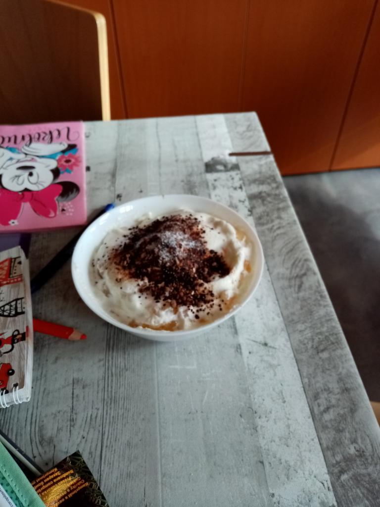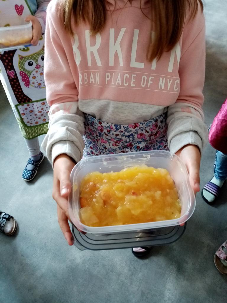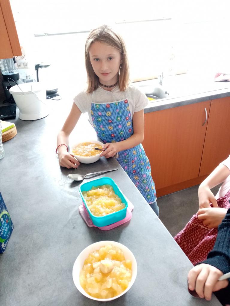 Dnes jsme si udělali nepečený jablíčkový dort, kde jsme si znovu připomněli, jak se vaří pudink, který jsme se naučili vařit na první schůzce. Tentokrát jsme si na něj dali šlehačku a opět granko, které nám ještě zbylo od minule. "Dort" jsme si dali do misek, aby si ho děti mohly hned sníst nebo o