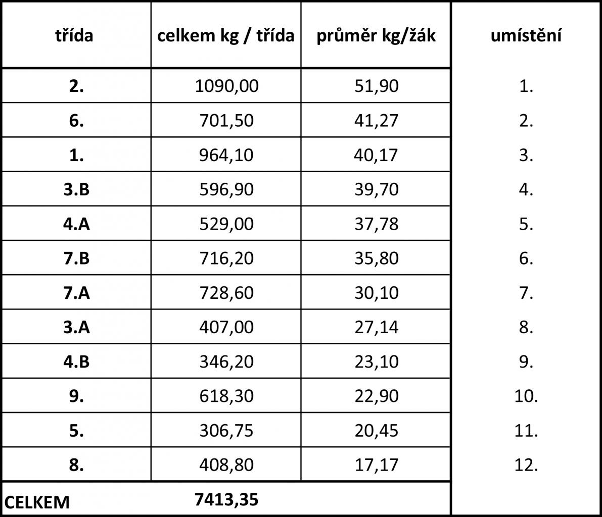 Nejlepší sběrači v soutěži jednotlivců: 1. místo: žák 2. třídy s 306 kg, 2. místo žákyně 7. A s 230 kg, 3. místo žákyně 6. třídy s 203 kg. 100 a více kilogramů přineslo celkem dvacet žáků, ti budou odměněni poukázkami, nebo drobnými dárky na konci školního roku.