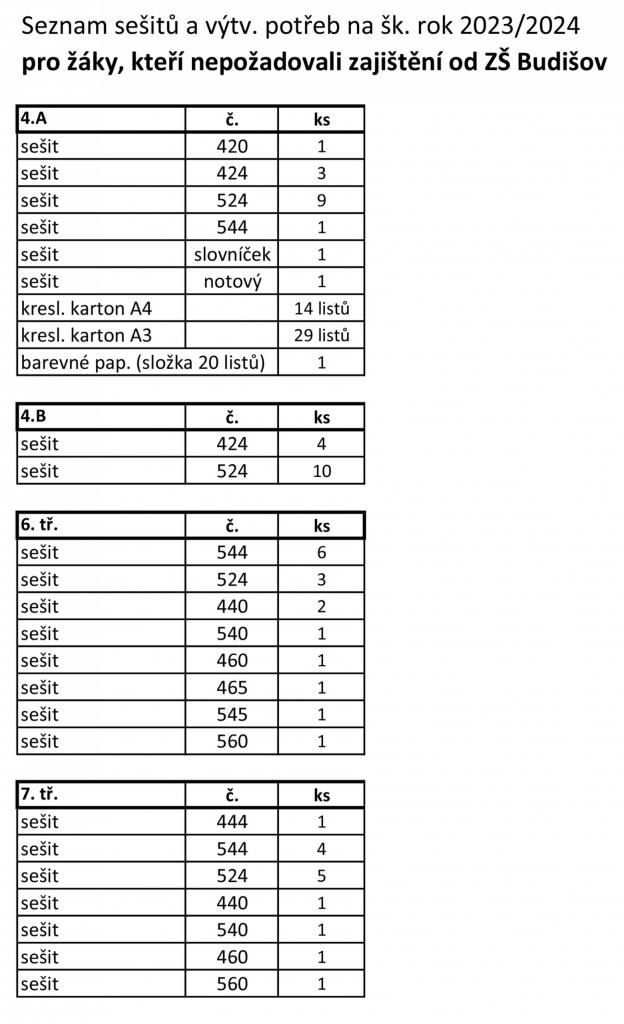 Seznam sešitů a výtv. potřeb na šk. rok 2023/2024 pro žáky, kteří nepožadovali zajištění od ZŠ Budišov