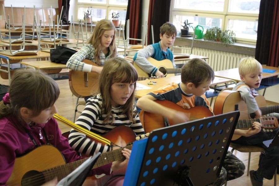 Ve školním roce 2013/2014 navštěvuje kytarový kroužek 10 dětí od 3. do 7. třídy. Scházíme se každou středu 12.30 - 13.30 hodin. Nejdříve zkontrolujeme naladění kytar, usadíme se u stojánků s notami a začneme pracovat. Naučit se hrát na kytaru znamená nejen přijít jednou za týden do kroužku, ale téměř denně poctivě cvičit. Že každý začátek je těžký, o tom se již děti přesvědčily. Ale také již prokázaly dostatek pevné vůle, a tak se základními akordy prokousáváme docela úspěšně a již jsme začali zkoušet i čtyřčtvrťový rytmus. Už se těšíme, až budeme moci vystoupit na veřejnosti a pochlubit se tím, co umíme.