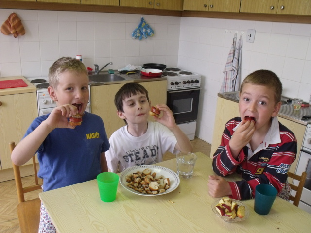 14.4. - Plánované rozdělávání ohně a opékání špekáčků nám překazilo chladné počasí, déšť a kroupy, proto jsme zvolili náhradní variantu a špekáčky a topinky si osmažili na pánvích ve školní kuchyňce.